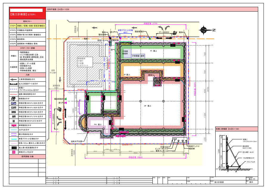 解体工事の順序を明確にする「施工ステップ図」と搬出入ゲート、詰所、足場などの配置を反映した「総合仮設図」の2種類の施工計画図を、AUTOCADを用いて作成いたします。